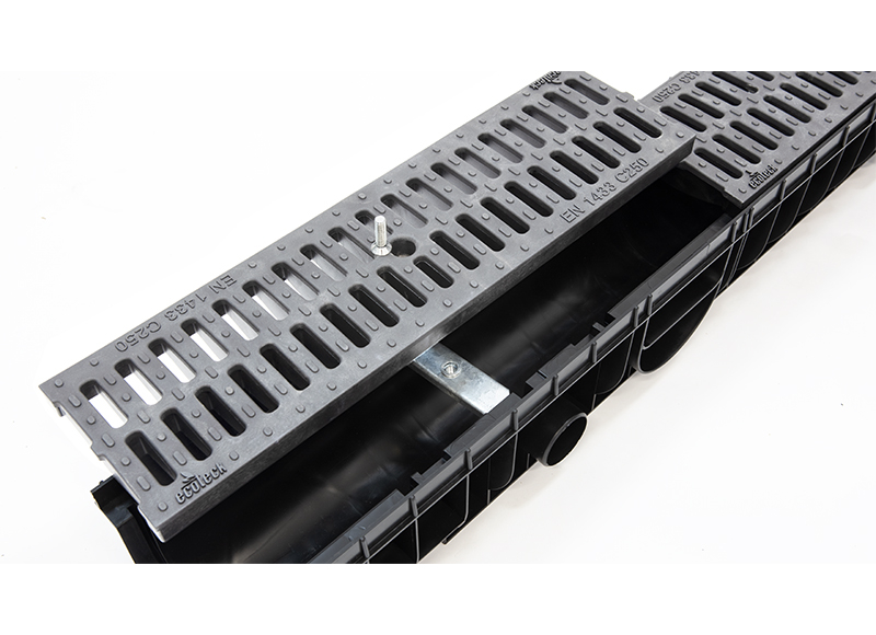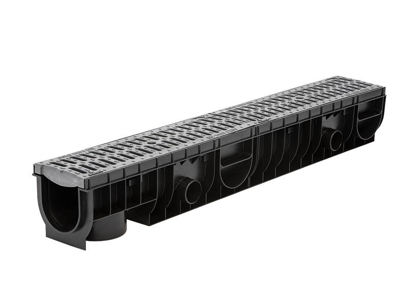 Главная / Продукция / Внешнее водоотведение / Medium DN 100 Series / КОМПЛЕКТЫ / Лоток Ecoteck MEDIUM 100.125 h145 с решеткой пластиковой, кл. C250 (металлик)