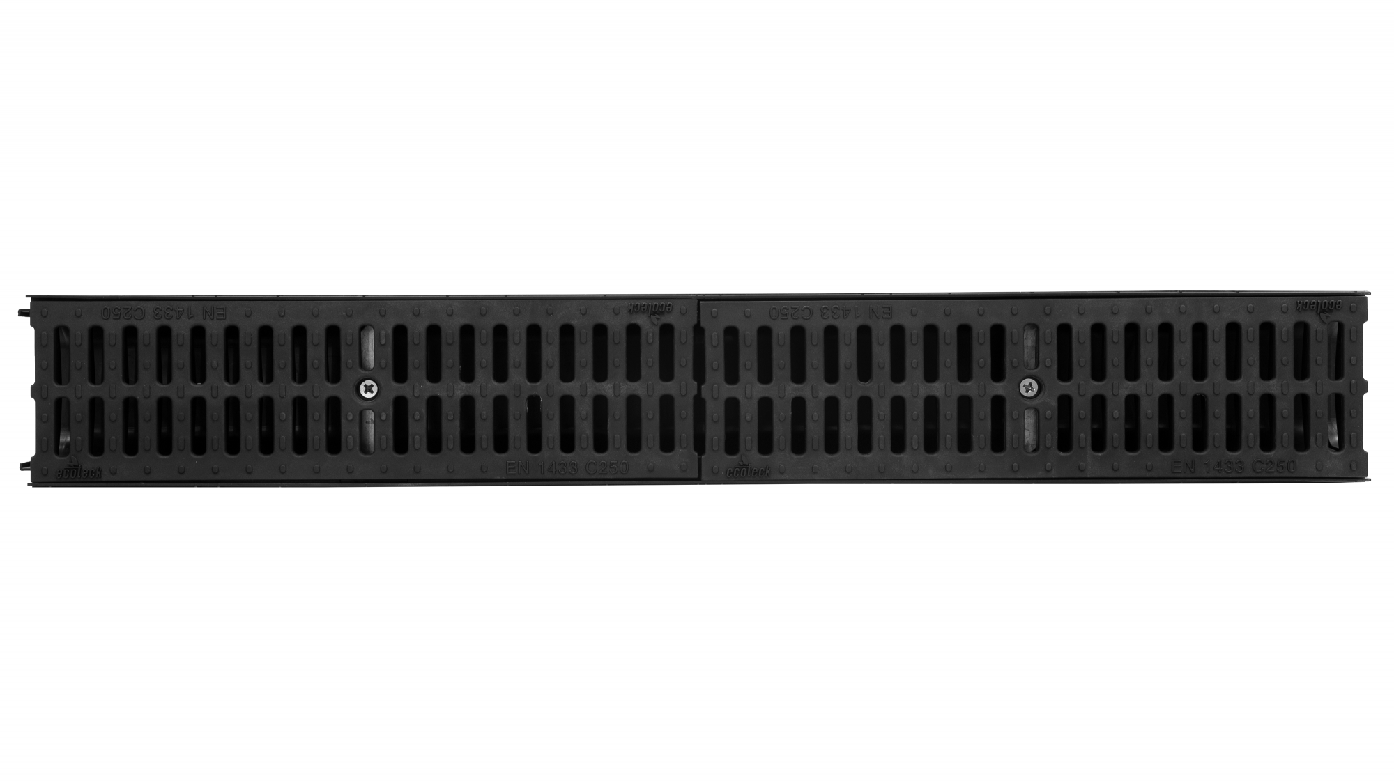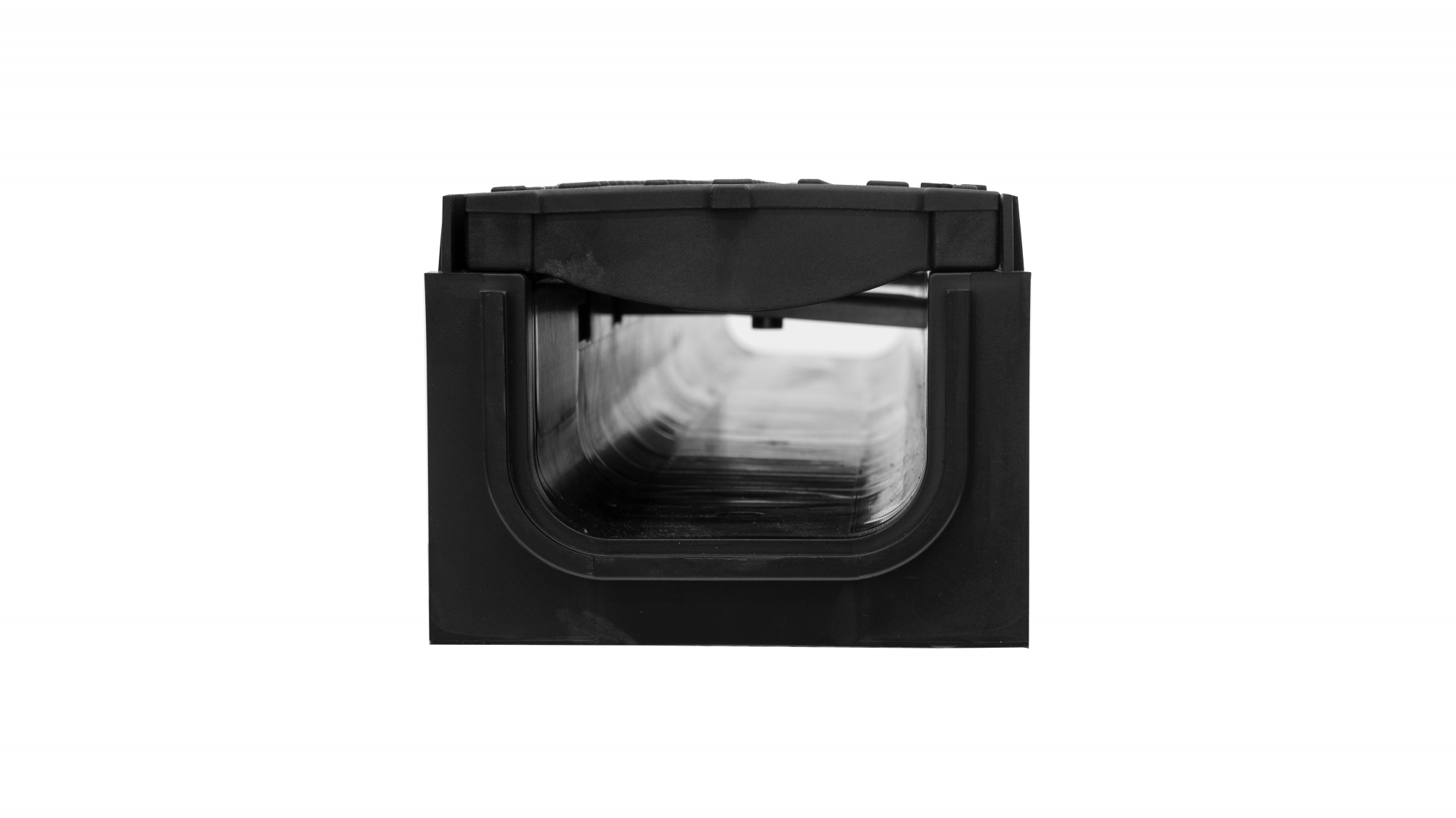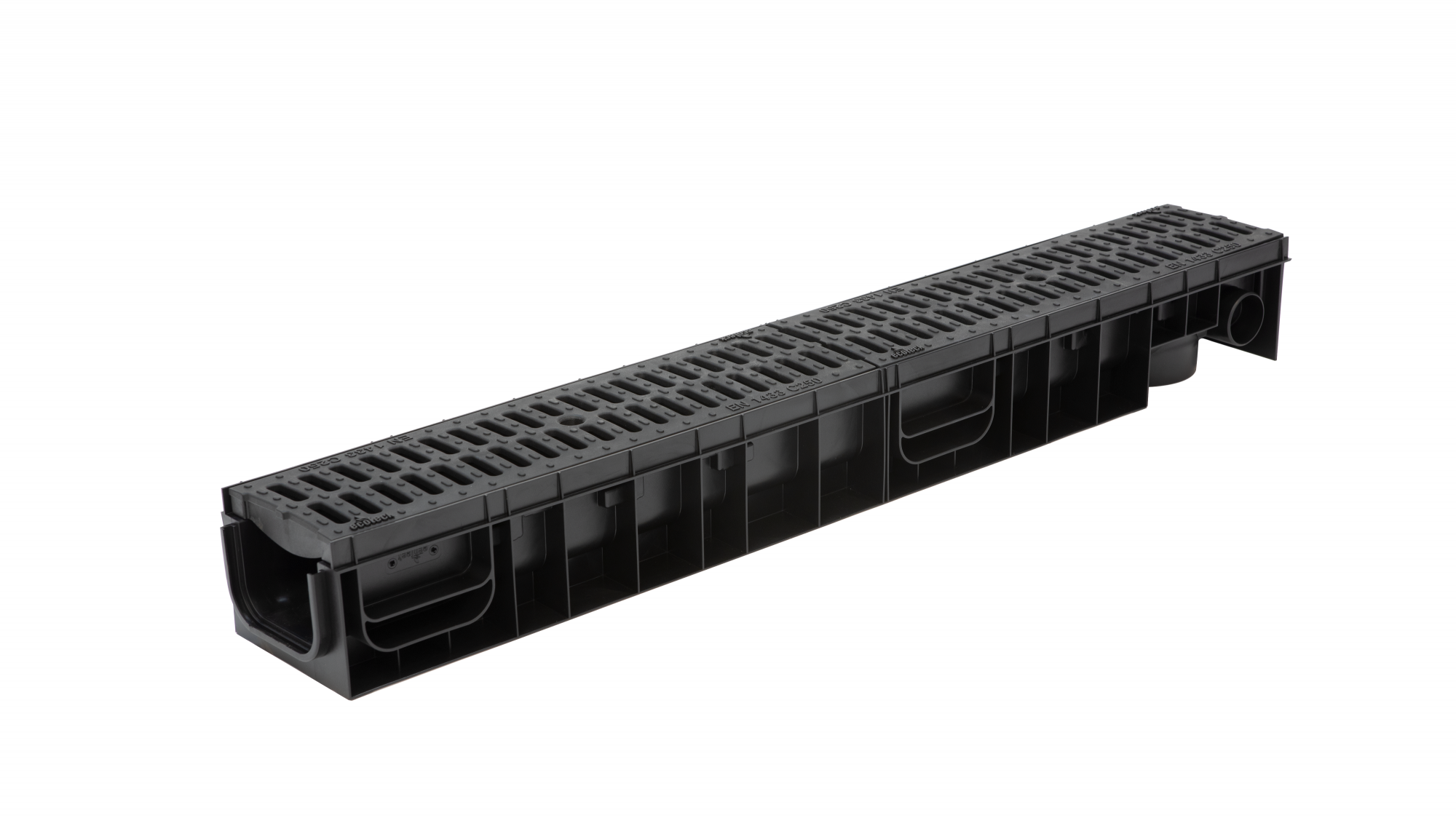 Главная / Продукция / Внешнее водоотведение / Medium DN 100 Series / КОМПЛЕКТЫ / Лоток Ecoteck MEDIUM 100.95 h115 с решеткой пластиковой, кл. C250 (черный)